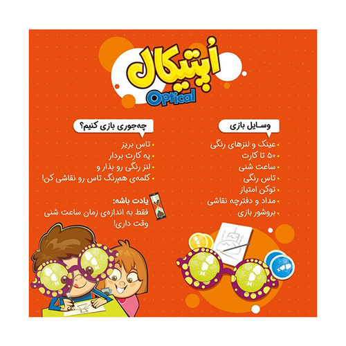سایر توضیحاتروی هر کارت بازی 3 کلمه با رنگهای مختلف (قرمز، زرد و سبز) نوشته شده است. هر بازیکن در نوبت خود باید با توجه به قوانین مشخص شده، یکی از کلمهها را نقاشی کند. اولین بازیکن در نوبت خود تاس میریزد. کارت رویی را برمیدارد و بدون آنکه بازیکنان دیگر کارت را ببینند، کلمة همرنگ با تاس را به خاطر میسپارد. کارت را به پشت مقابل خود قرار میدهد. حالا عینک با لنز سبز را روی چشم خود میگذارد و ساعت شنی را برمیگرداند و کلمة موردنظر را نقاشی میکند. باید خیلی سریع عمل کند و تا قبل از تمام شدن زمان، نقاشی را کامل بکشد. به محض آنکه زمان به پایان رسید، باید کاغذ را رو به بازیکنهای دیگر بگیرد تا کلمهای را که نقاشی کرده است، حدس بزنند.