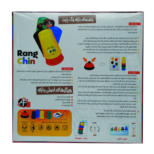 بازی رنگ چین بازی افزایش سرعت عمل و تمرکز است. به هر کدام از بازیکنان پنج لیوان از هر رنگ داده و کارتهای بازی را بر زده و به هر کدام از بازیکنان یک کارت بدهید. بر روی کارتها تصاویری رنگی نقاشی شده است هر نفر می بایست لیوان های رنگی را مطابق با رنگ نقاشی های درون کارتها روی هم بچیند. هر بازیکنی زودتر این کار را انجام دهد باید زنگ را بزند. در طی بازی بازیکنان می بایست سعی کنند ساعت شنی را که از اول بازی بکار افتاده از خود دور کنند هر بازیکنی که لیوان هایش را مرتب کرد می بایست ساعت شنی را مقابل بازیکن دیگر قرار دهد. در انتها بازیکنی که ساعت شنی روبرویش قرار دارد بازنده خواهد بود.