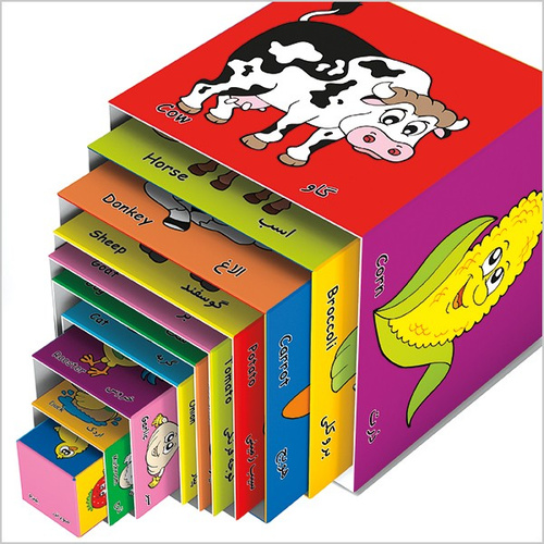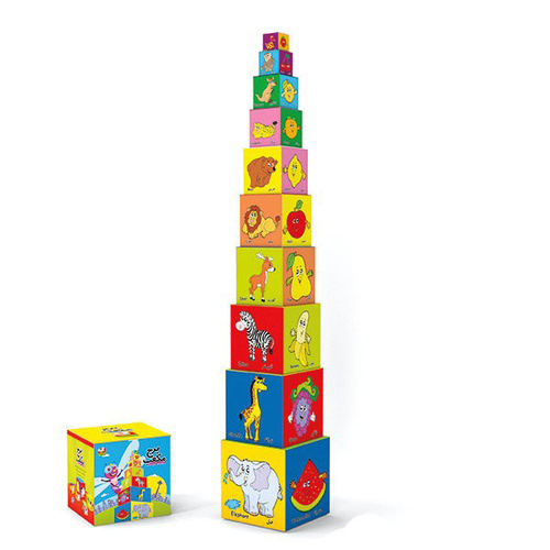 برج مکعب شامل 10 مکعب از جنس مقوای سخت در 10 اندازه مختلف است که به کودک کمک میکند تا با روی هم چیدن مکعبها، ضمن تقویت ماهیچههای ظریف دست خود، مفاهیم متنوعی را فرا بگیرد. در وجوه مختلف هر مکعب رنگ ها، حیوانات اهلی، حیوانات وحشی، میوهها و سبزیجات با نام فارسی و انگلیسی آنها آمده است تا کودک با نام آنها آشنا شود. در ابتدا کودک باید مکعبها را به ترتیب از بزرگ به کوچک روی هم بچیند و سپس بعد از درک مفهوم اندازه، برجی متشکل از 10 طبقه با دستهبندیهای ذکر شده بسازد؛ به گونهای که در هر وجه آن یکی از موضوعات مذکور قرار گیرد.
